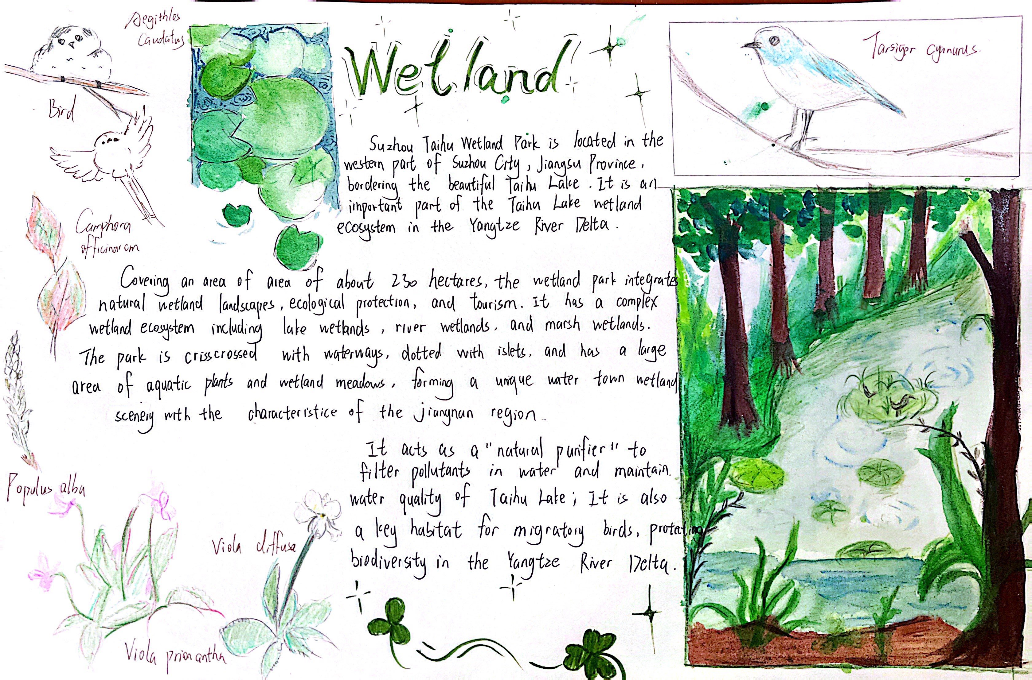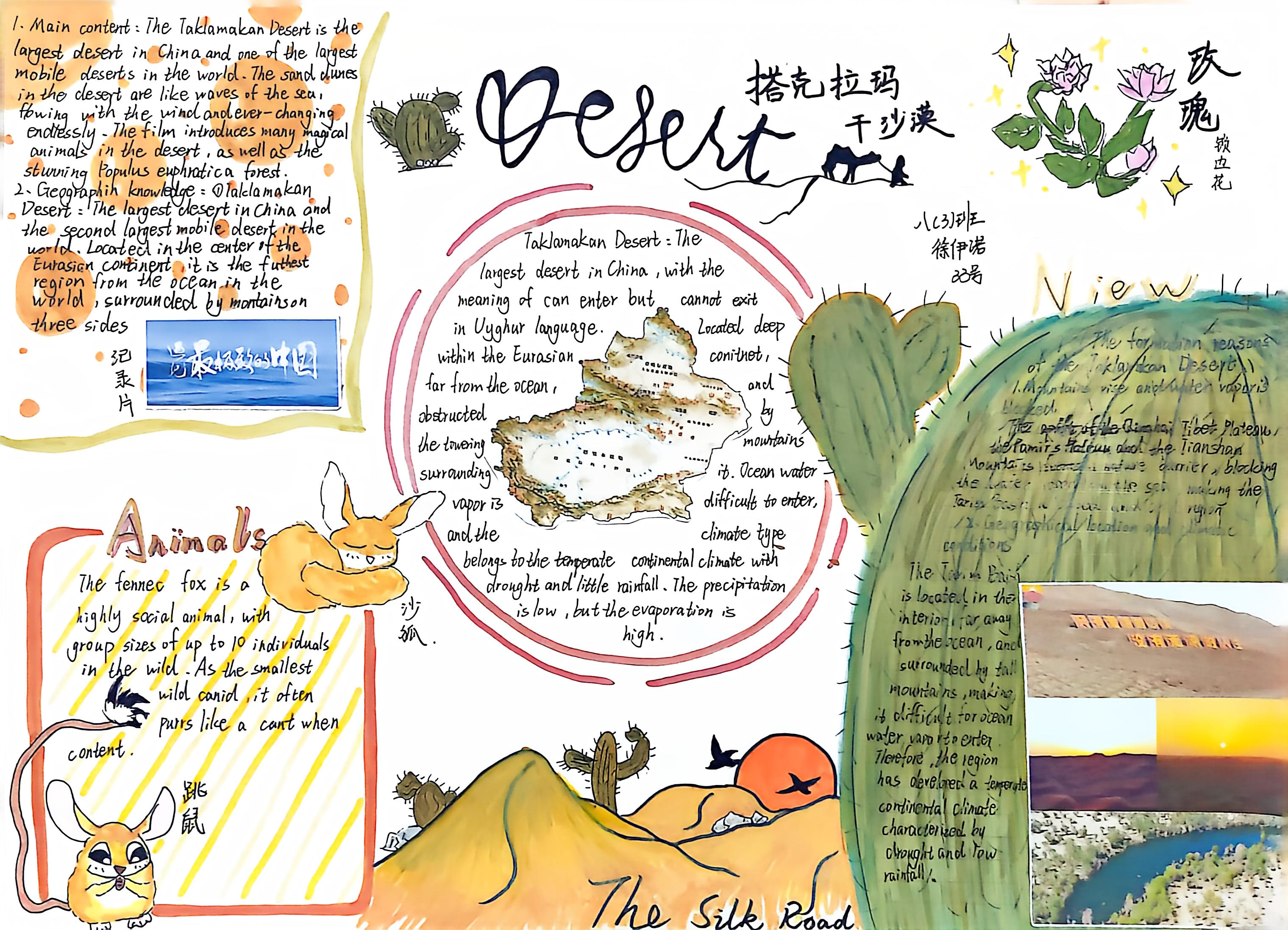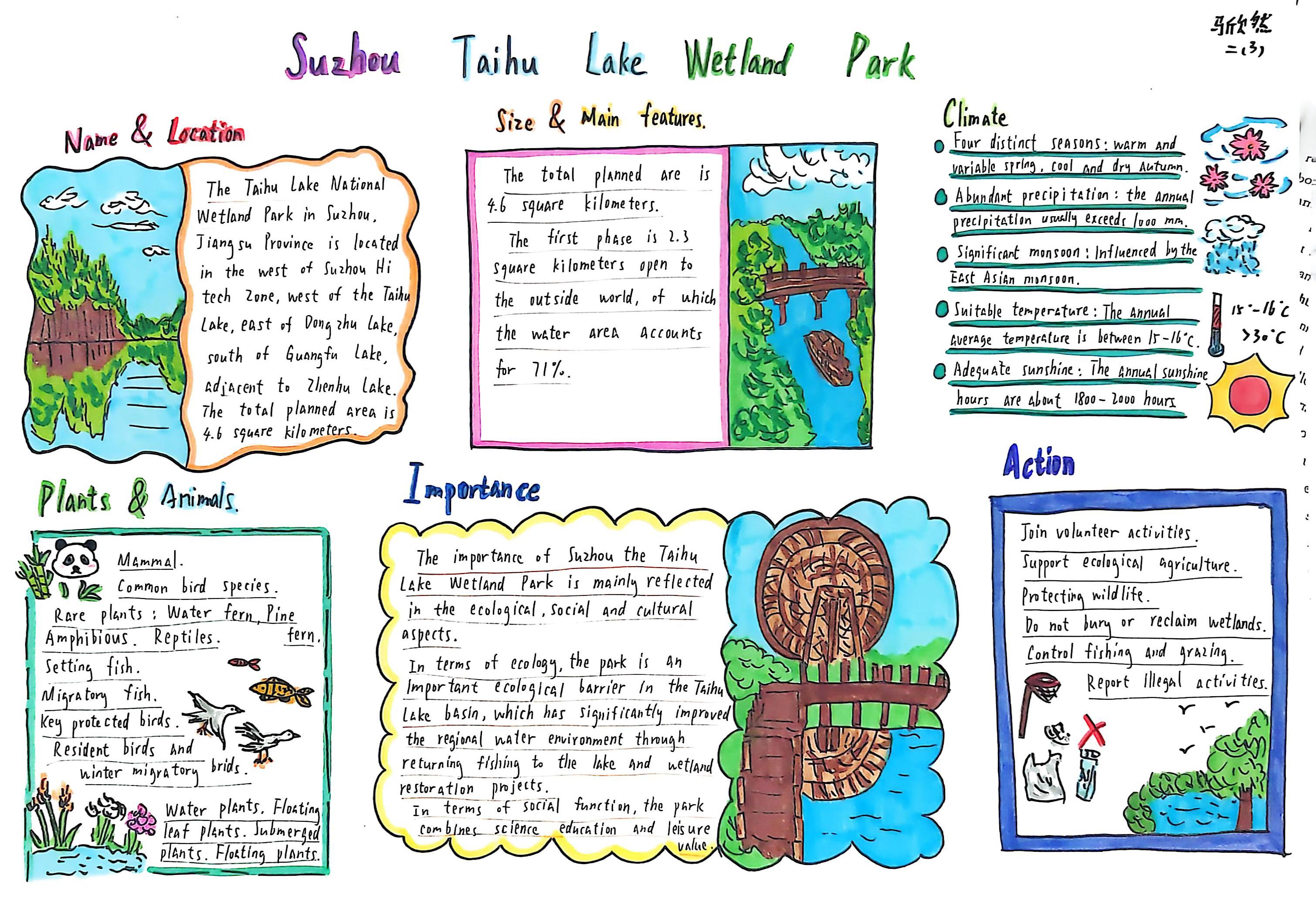 生态的画卷,铺展在太湖湿地的烟波浩渺里,绽放在热带雨林的绿意盎然中,藏在三江源的冰原辽阔间,映在塔克拉玛干的沙海苍茫旁。在“Explore探秘·生态画卷”任务中,同学们化身生态勘探师,循着影像与文字的印记,倾听每一处生态的独白——梳理其方位风貌,解读其气候禀赋,记录其生灵故事。随后,或以手抄报勾勒山河轮廓,或以思维导图梳理生态脉络。一笔一画,是对自然奥秘的执着探寻;一词一句,是对英语能力的扎实淬炼,让生态之美在笔尖流淌,让知识之泉在心田润泽。