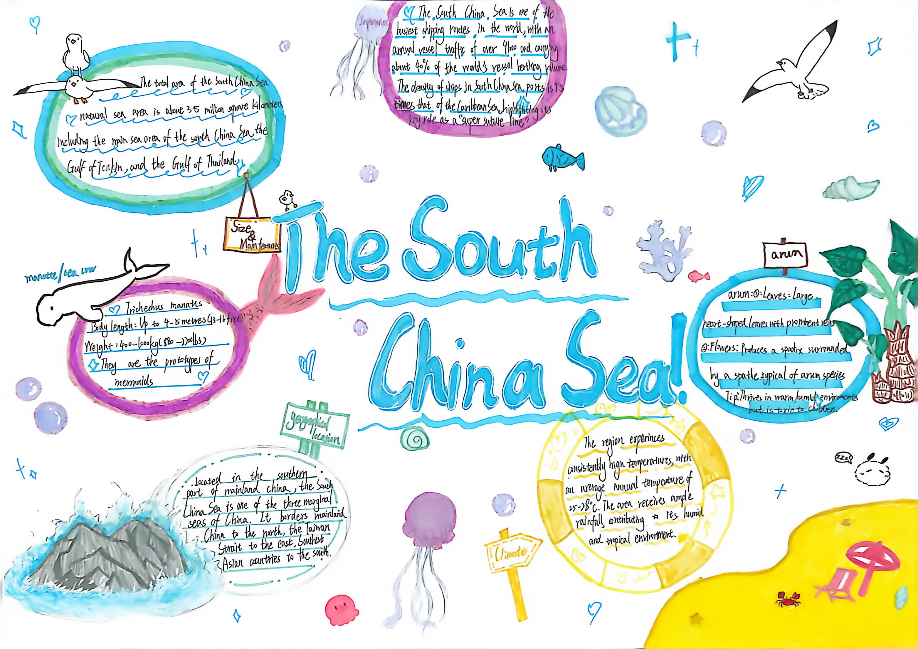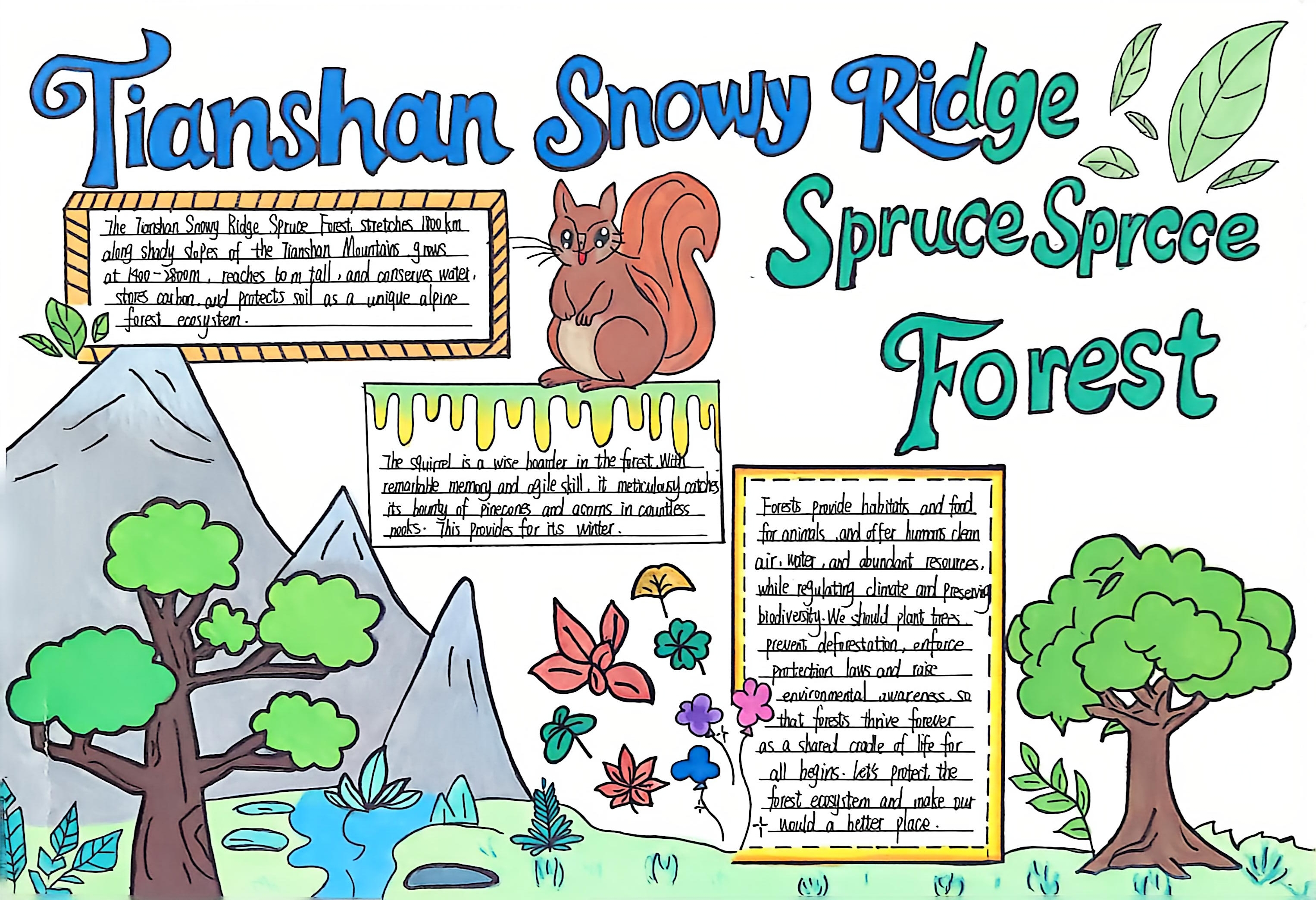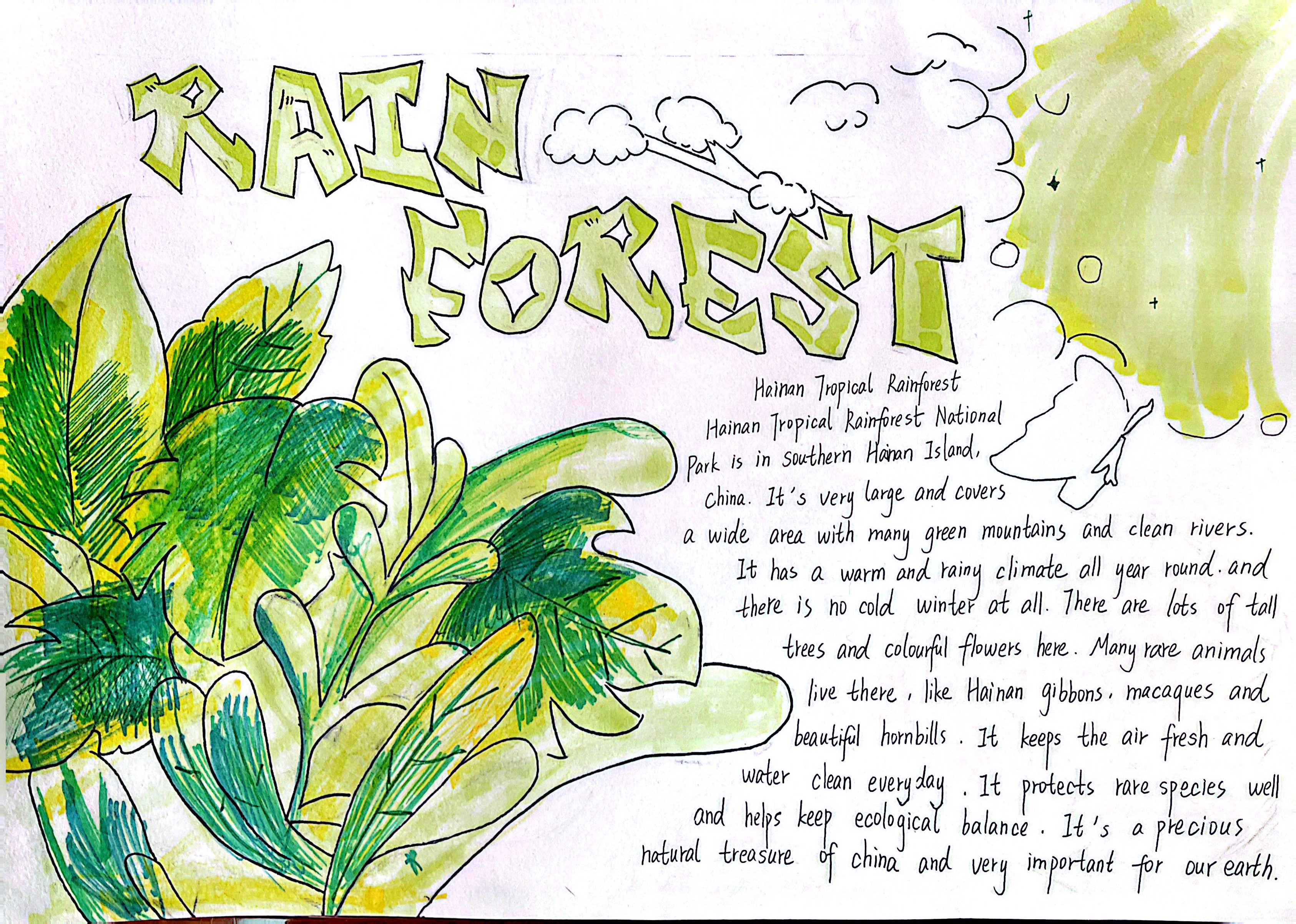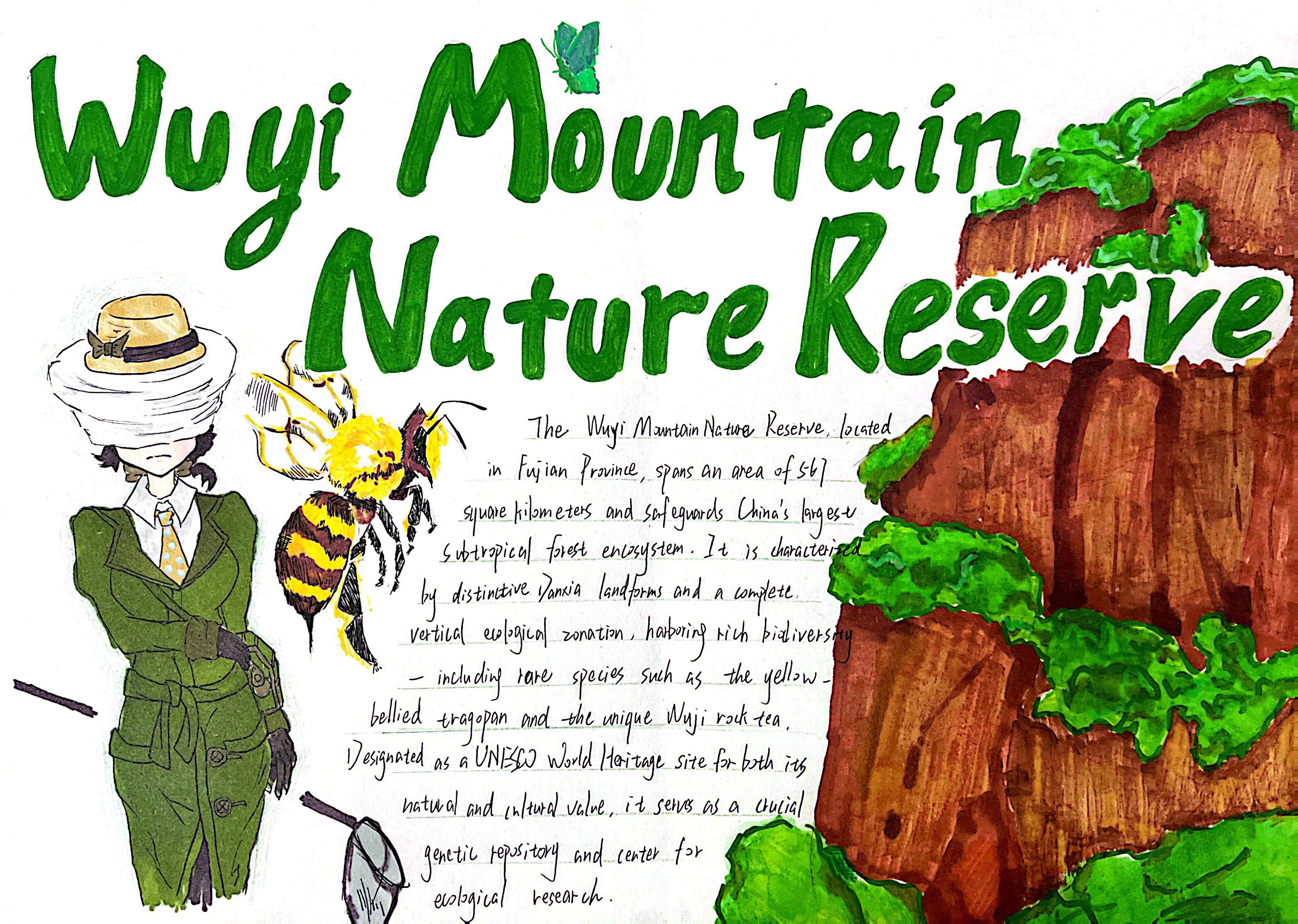 生态的画卷,铺展在太湖湿地的烟波浩渺里,绽放在热带雨林的绿意盎然中,藏在三江源的冰原辽阔间,映在塔克拉玛干的沙海苍茫旁。在“Explore探秘·生态画卷”任务中,同学们化身生态勘探师,循着影像与文字的印记,倾听每一处生态的独白——梳理其方位风貌,解读其气候禀赋,记录其生灵故事。随后,或以手抄报勾勒山河轮廓,或以思维导图梳理生态脉络。一笔一画,是对自然奥秘的执着探寻;一词一句,是对英语能力的扎实淬炼,让生态之美在笔尖流淌,让知识之泉在心田润泽。