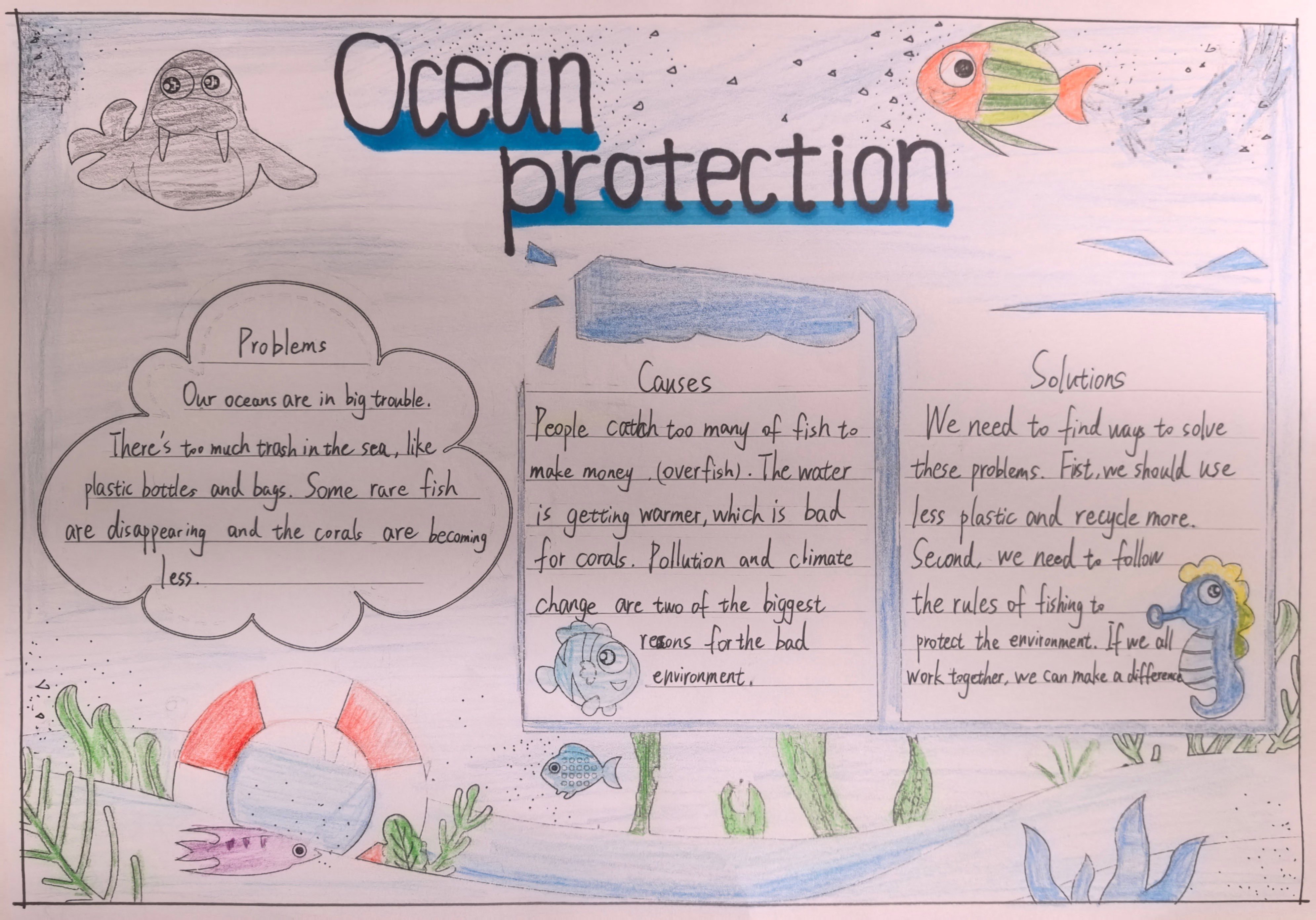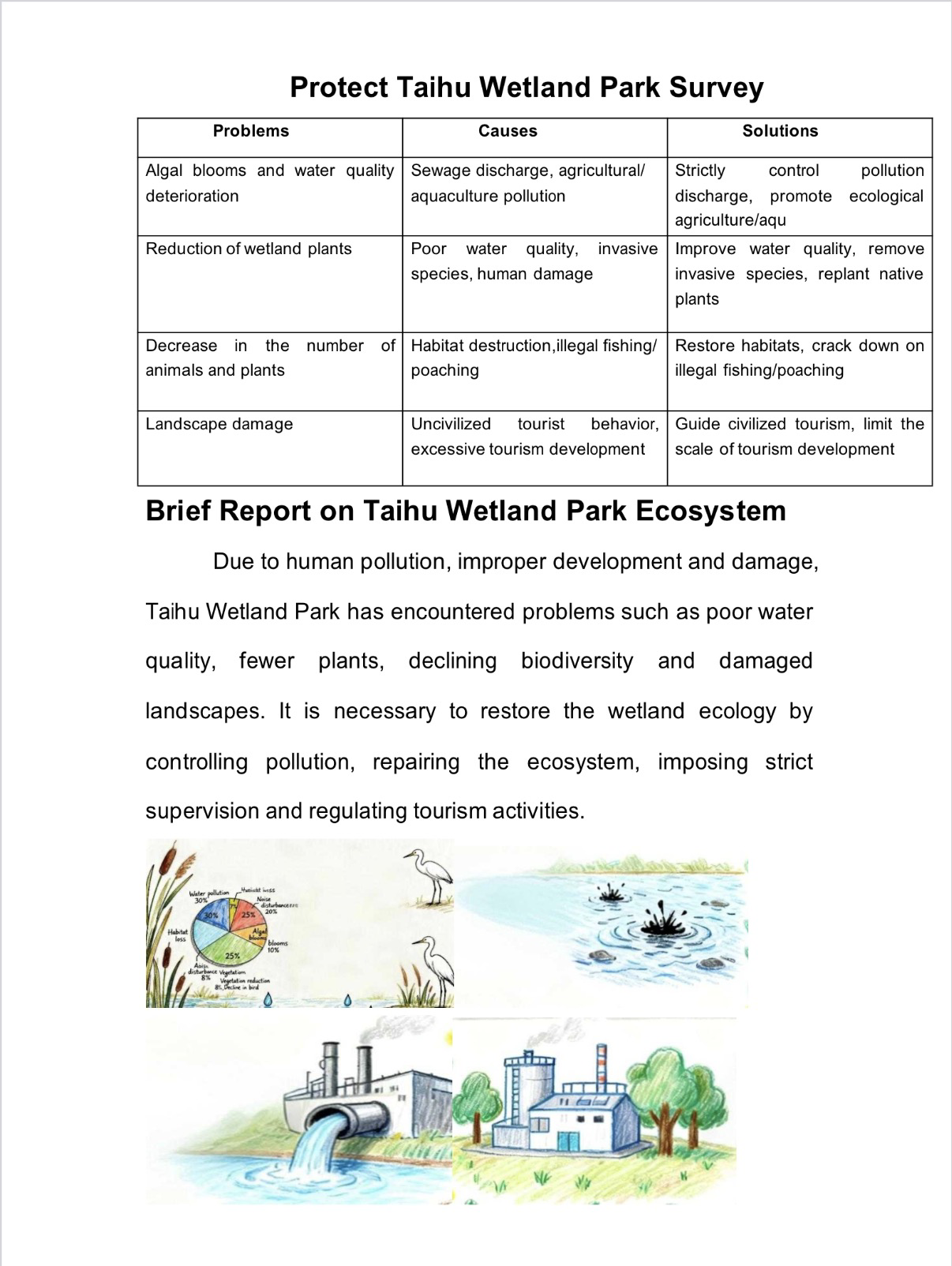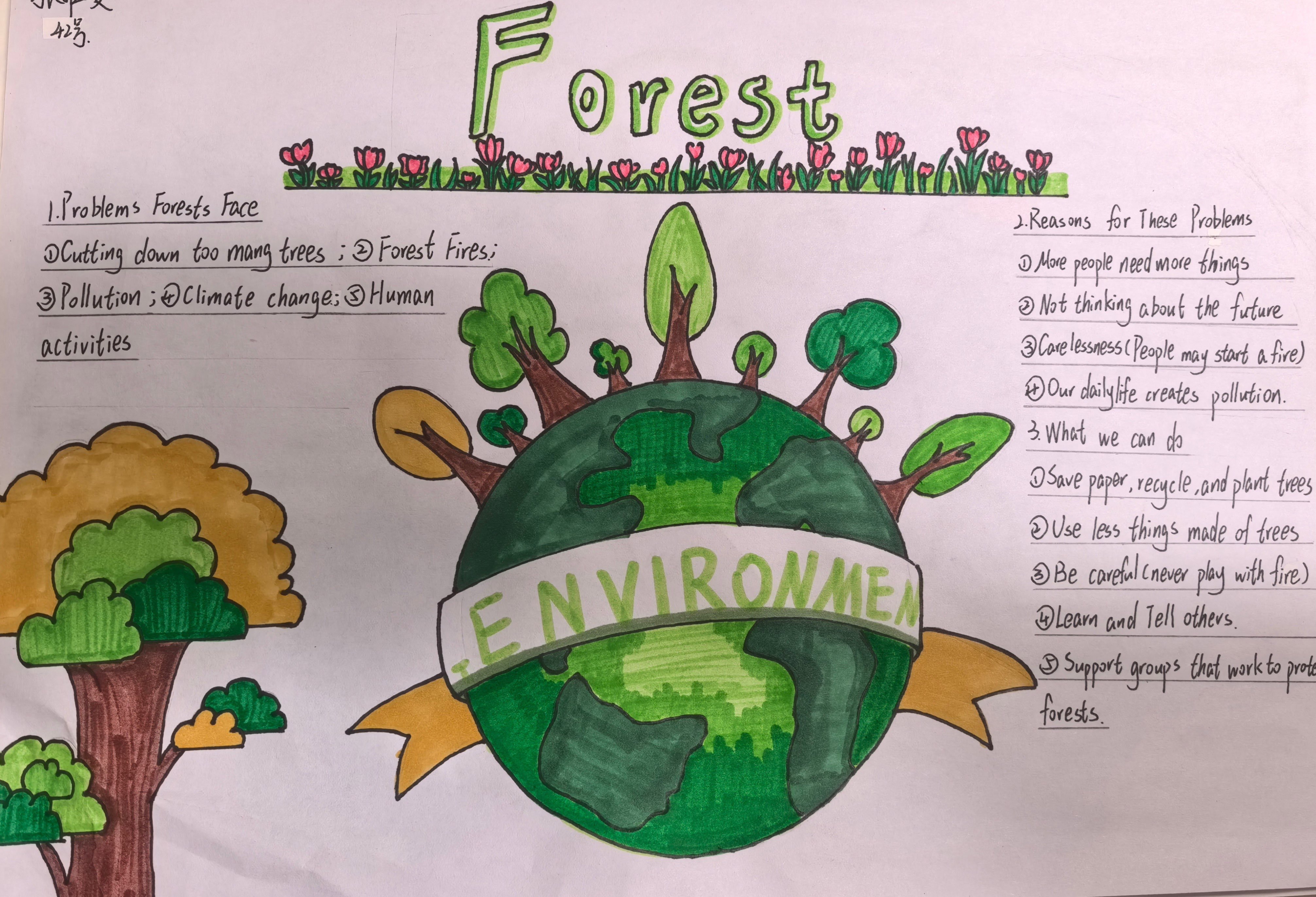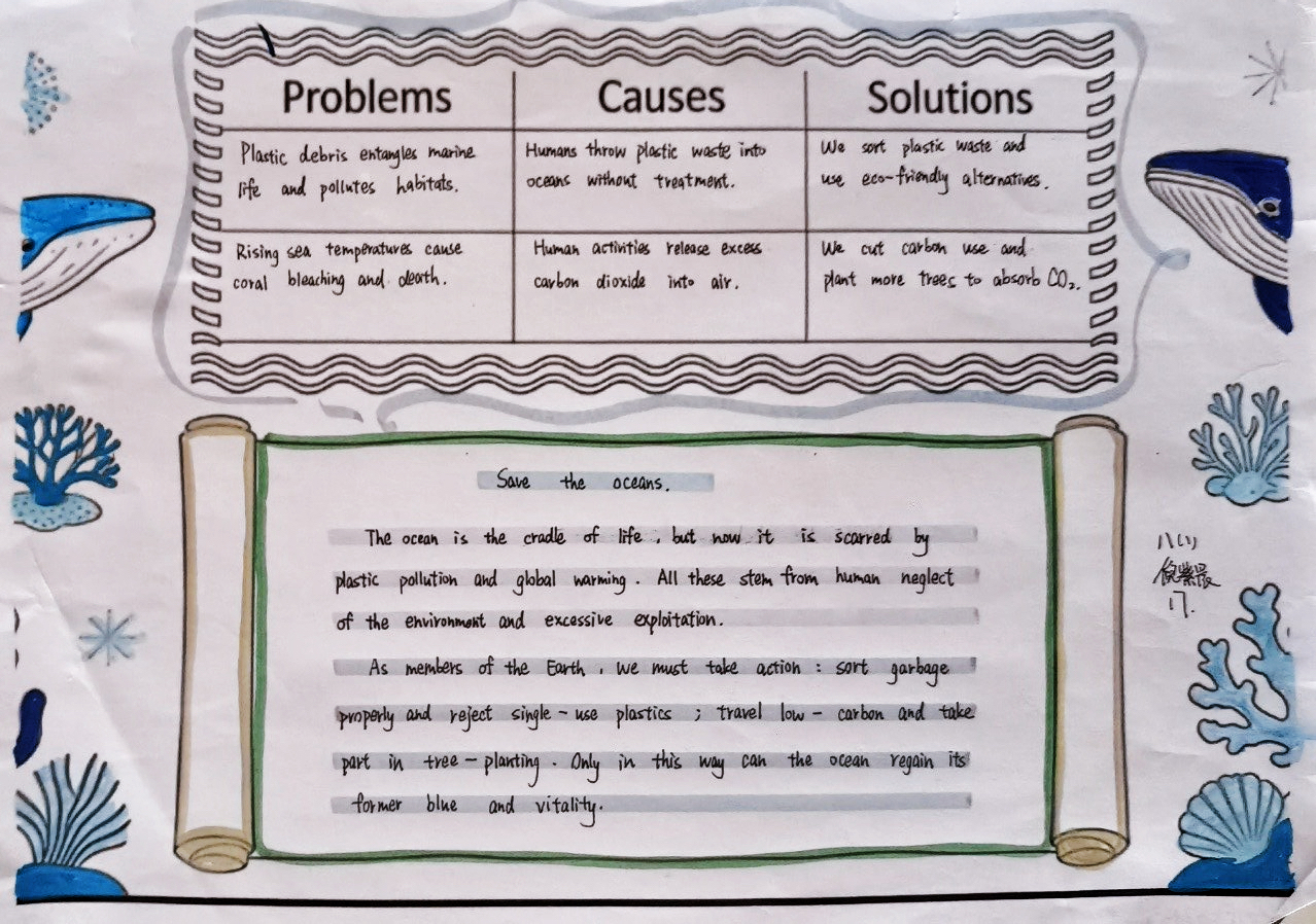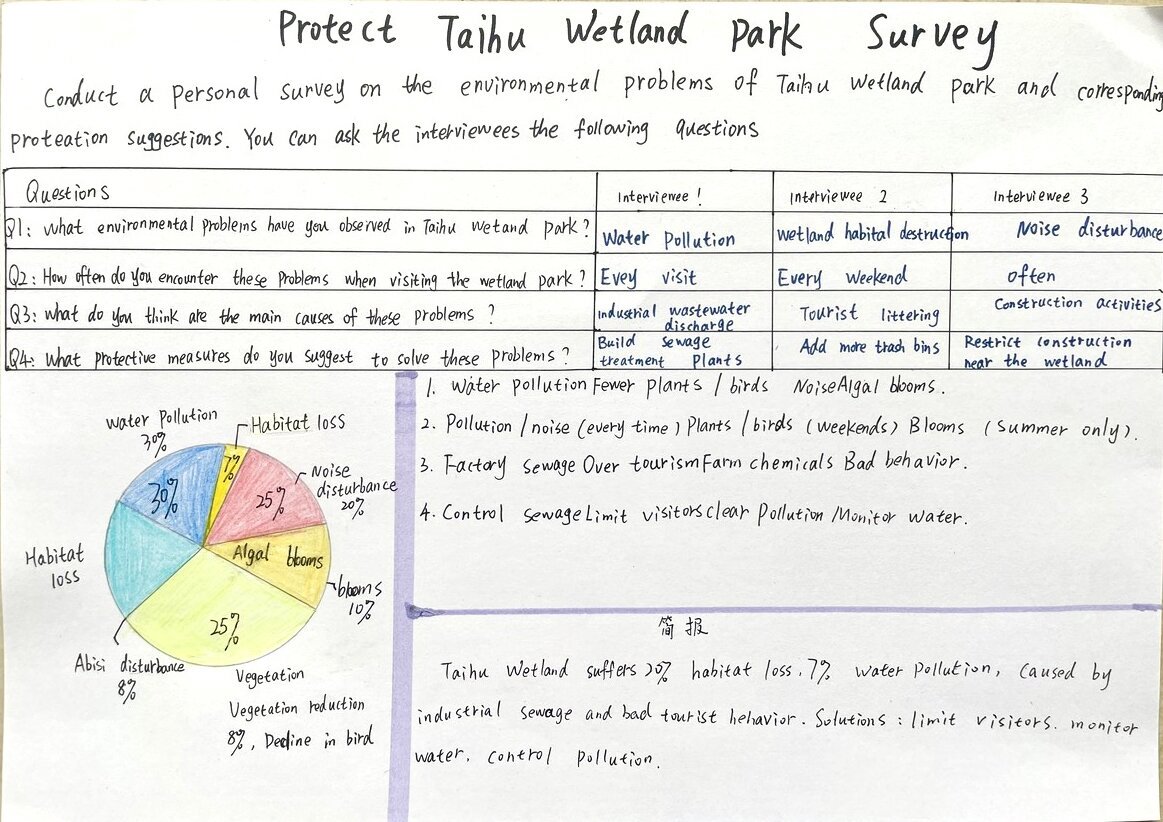 当生态的画卷浮现裂痕,便需以理性为笔,书写疗愈的方案。在“Examine析危·深入诊断”环节中,同学们转型为生态诊疗师,聚焦污染侵蚀、生物多样性衰减等生态困境,深挖问题根源,构思保护良策。一张张图文交织的调查表,铺展开理性与关切;一份份清晰有力的英文报告,沉淀下思考与承诺。英语在此刻成为剖析问题的利器,让生态保护的认知在思辨中扎根;实践在此处化作启迪智慧的阶梯,让“活教育”的理念在探索中生长。