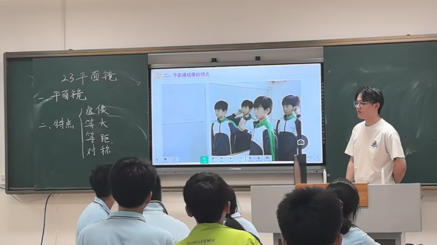 周文杰老师以“实验探究”为核心,通过“生活情境→猜想假设→实验验证→理论分析→应用拓展”的主线,帮助学生构建平面镜成像的知识体系;本节课先用骰子魔术作为引入,然后引导学生用玻璃板、等大蜡烛等器材完成“像与物大小、位置关系”的探究实验,归纳成像特点;最后组织学生围绕平面镜成像的特点手工制作3d投影仪,让学生在实践中学习,加深学生对所学知识的理解,培养了学生敢于思考、敢于探索、敢于创新的精神。