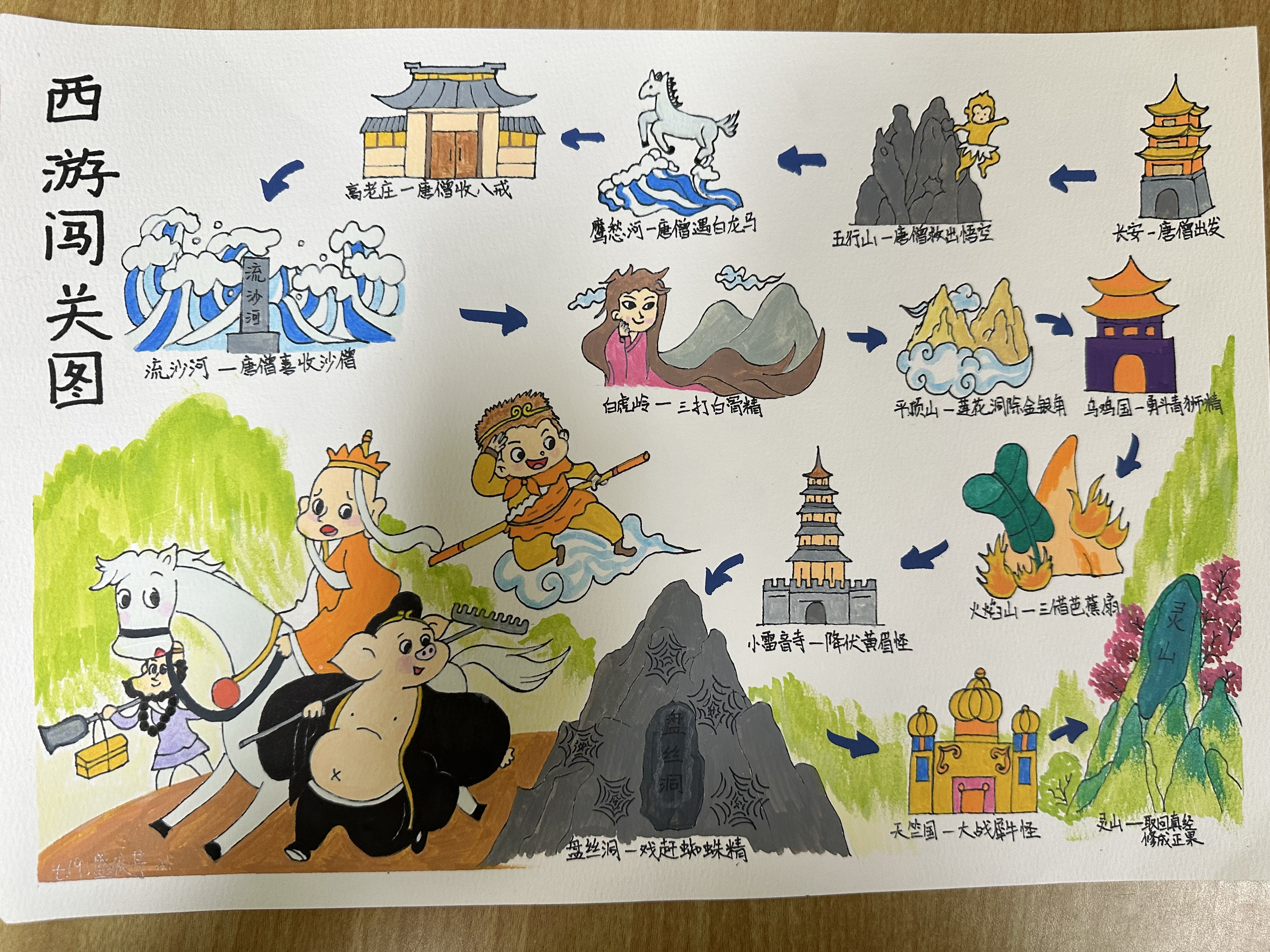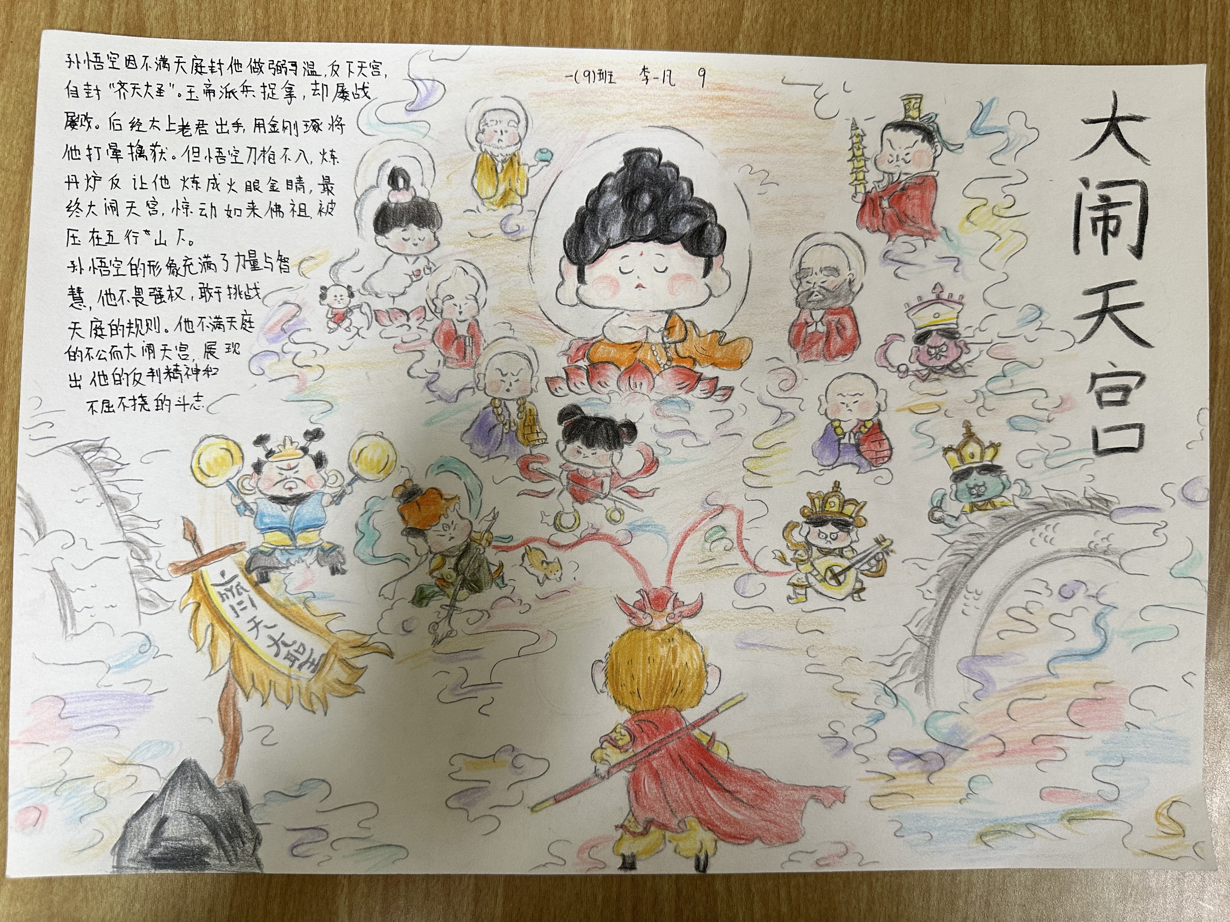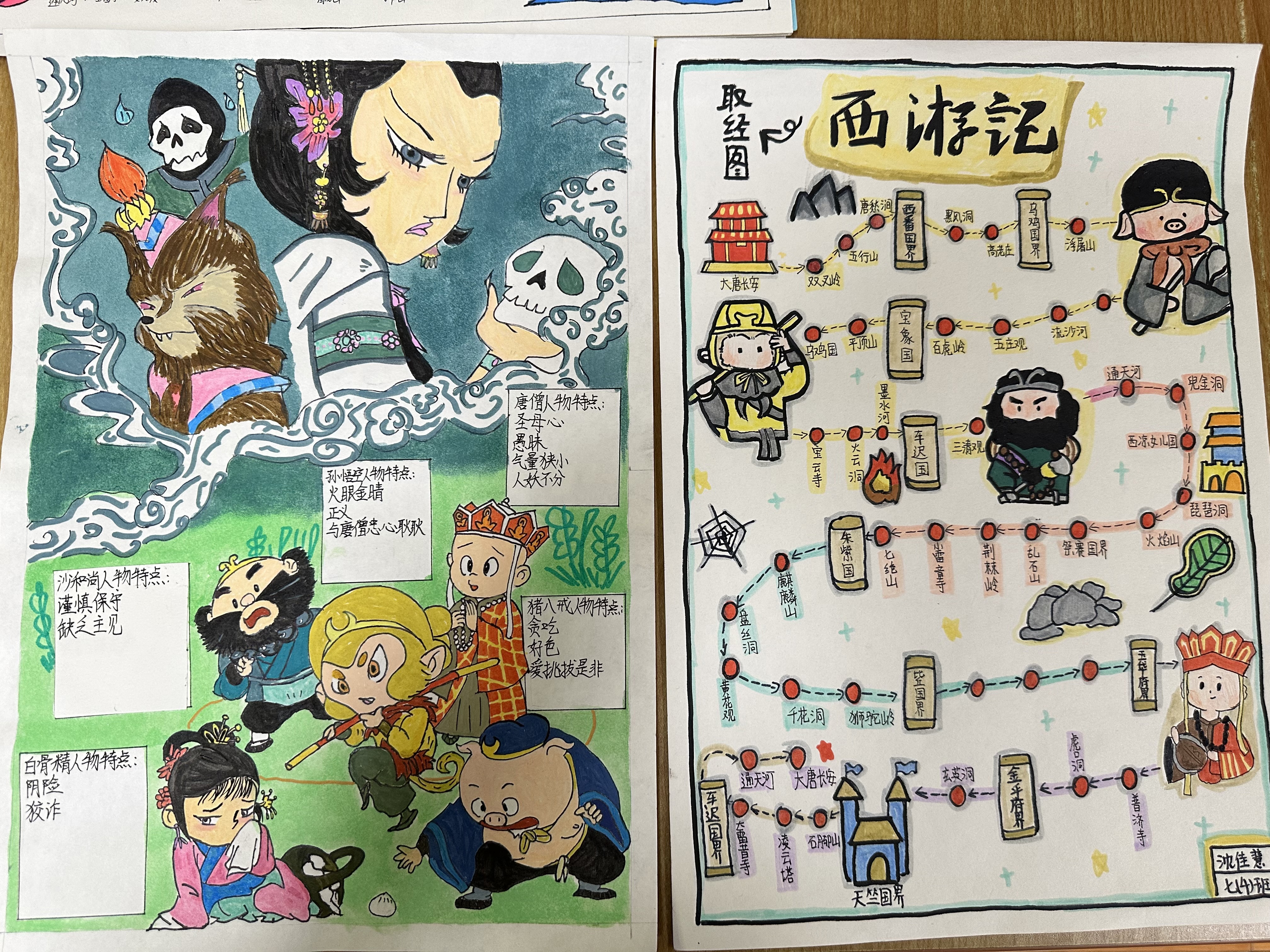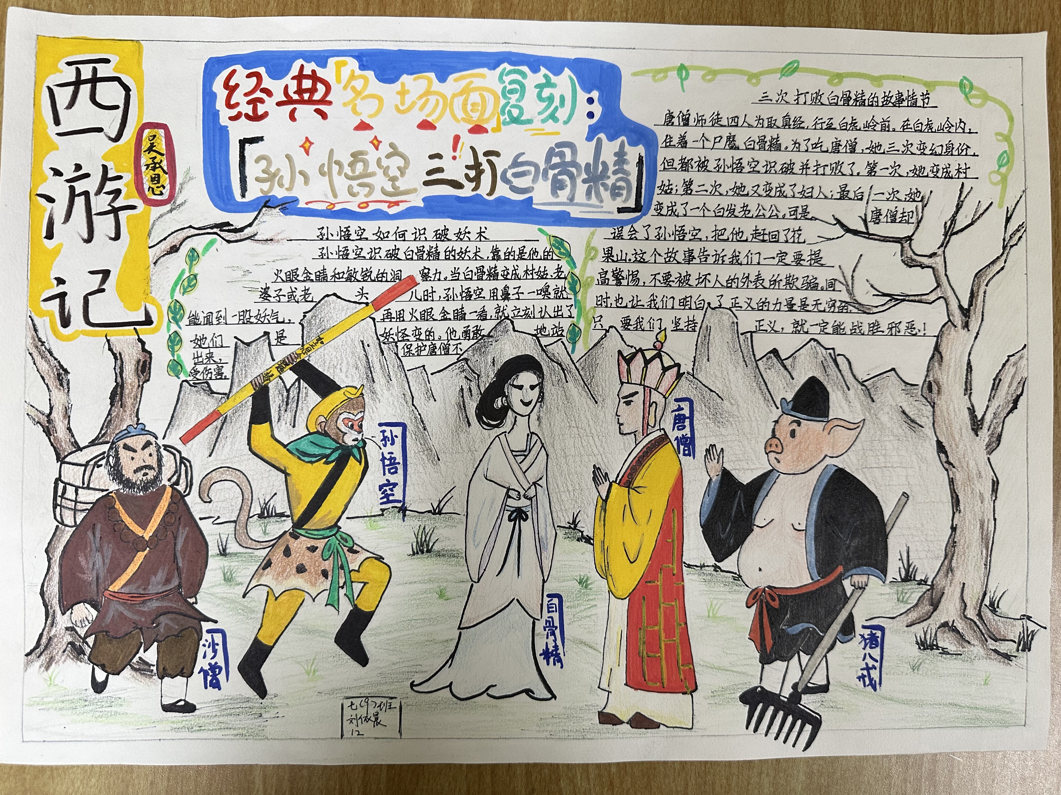 “欲知造化会元功,须看西游释厄传”,初一学生们以手抄报为载体,将《西游记》的奇幻世界凝于笔尖。他们或是勾勒孙悟空 “金睛火眼辨妖魔” 的果敢,用浓墨重彩凸显 “大闹天宫” 的豪迈;或是描绘唐僧 “万里西行求真经” 的虔诚,以细腻笔触展现 “三打白骨精” 中的坚守;亦或是刻画猪八戒 “贪吃憨直显真性情” 的鲜活、沙和尚 “任劳任怨护师徒” 的沉稳,每一笔线条都藏着对人物的理解,每一抹色彩都饱含对故事的热爱。